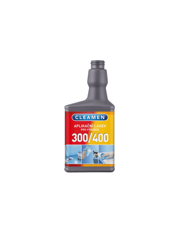 Aplikační láhev je již opatřena etiketou produktu, pro který je určena a díky tomu usnadňuje orientaci pracovníků v úklidu snadno čitelnou a přehlednou informací, která napovídá k jakému účelu je produkt určen, na jaké povrchy a jakou metodou se má používat. Láhev naplňte přiměřeným množstvím vody a poté nadávkujte CLEAMEN 300/400 dle doporučeného ředění uvedeného v tabulce na etiketě koncentrovaného prostředku. Našroubujte rozprašovač a rovnoměrně nanášejte na čištěný povrch nebo do úklidové utěrky. Na určené místo na etiketě si nesmazatelnou fixou můžete napsat mimo jiné také zvolenou koncentraci produktu v roztoku. Aaplikační láhev již obsahuje kombinovaný rozprašovač - pěnič.