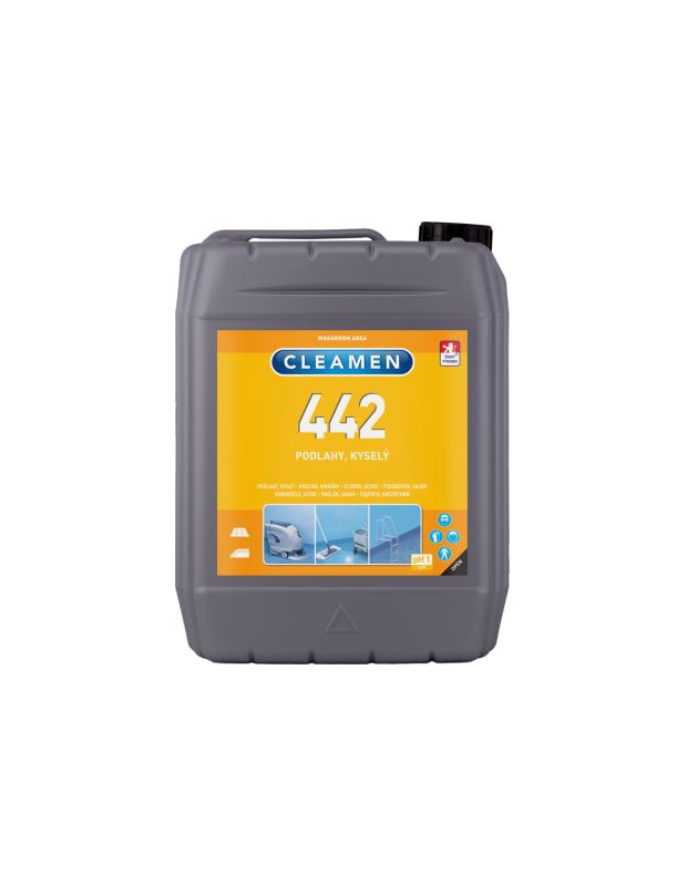 Výrobek (5L)je určen pouze pro profesionální použití, při nákupu, prosím, uveďte IČ. Nejvýkonější mycí a čistící prostředek na podlahy a povrchy, které jsou odolné kyselinám. Má víceúčelové použití, je určen na postavební, periodický i denní úklid. Používá se vždy zředěný dle tabulky podle účelu použití. Prostředek je nepěnivý a je určen pro ruční i strojní stírání, je silně koncentrovaný. Dokonale odstraňuje rez, vodní kámen a minerální usazeniny. Oživuje a čistí cementové spáry, ale ve vyšší koncetraci je vyžírá. Poradí si s protiskluzovou dlažbou a vyšlapanými cestičkami v broušených a slinutých dlažbách. Postavební úklid Spočívá v odstraňování vápenných nánosů, cementových zbytků, hlinky po malování, cementových závojů na dlažbách, hořečnatých a minerálních usazenin. Při postavebním úklidu povrch nejdříve navlhčíme, a poté aplikujeme naředěný roztok. Po odstranění nečistot povrch několikrát opláchneme čistou vodou. Lesklou dlažbu je vhodné po omytí zneutralizovat lehkým postřikem z tlakového rozprašovače Cleamenem 110 a vyleštit mikrovláknovým mopem. Periodický úklid Provádějte vždy jedenkrát měsíčně, abyste předcházeli usazování velkých nánosů vodního kamene. Prostředek na umytých plochách vždy nechávejte delší dobu působit, ale nezapomínejte na důkladné omytí čistou vodou. Denní úklid Denní používání prostředku Cleamen 442 ve slabé koncentraci vám zaručí, že při periodickém úklidu nebudete nuceni odstraňovat velké nánosy vodního kamene a minerálních usazenin. Pravidelnou péčí oživíte barvy a lesk dlažeb, obkladů a všech povrchů. Prostředek je nepěnivý a je určen pro ruční i strojní stírání, je silně koncentrovaný.